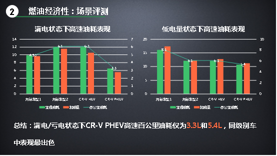 然后我們對比一下CR-V銳·混動e+與對標(biāo)車型的油耗差別。城市油耗和高速油耗,CR-V銳·混動e+是4.9L和5.4L,對標(biāo)車型1則是7.1L/8.0L,對標(biāo)車型2是5.7L/6.1L。