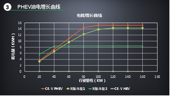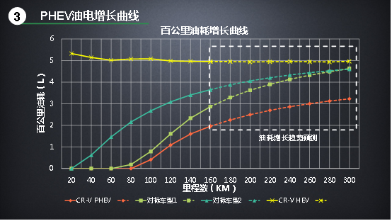 需要提示的是,這個曲線是在車輛滿電、均速22.3km/h的工況下測試獲得的,并且圖表只展示到300公里的趨勢預(yù)測,因此出現(xiàn)了三款PHEV車型的油耗均低于CR-V銳·混動的情況。伴隨著里程的進(jìn)一步延長,或者直接以低電量工況測試,對標(biāo)車型1和對標(biāo)車型2的油耗數(shù)據(jù)會持續(xù)增長并超過CR-V銳·混動的油耗(其中對標(biāo)車型1會達(dá)到7.1L左右,對標(biāo)車型二會達(dá)到5.7L左右),而CV-R銳·混動e+的峰值則只會與CR-V銳·混動接近(4.9L左右)。