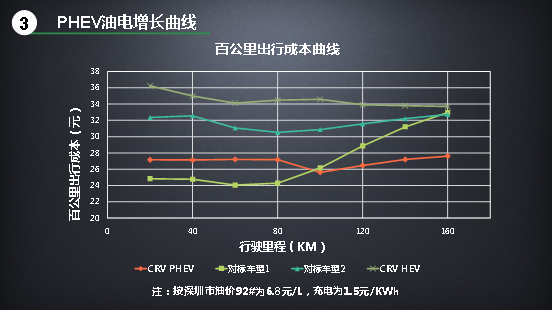 最后一個,也是更直觀的,即百公里出行成本曲線——它直接對應(yīng)到你花的“錢”。圖表看上去復(fù)雜,其實(shí)也很直觀:橫軸對應(yīng)多少公里,縱軸找到出行成本的金額即可。那么很清晰,100公里及以上,CR-V銳·混動e+的成本是最低的。